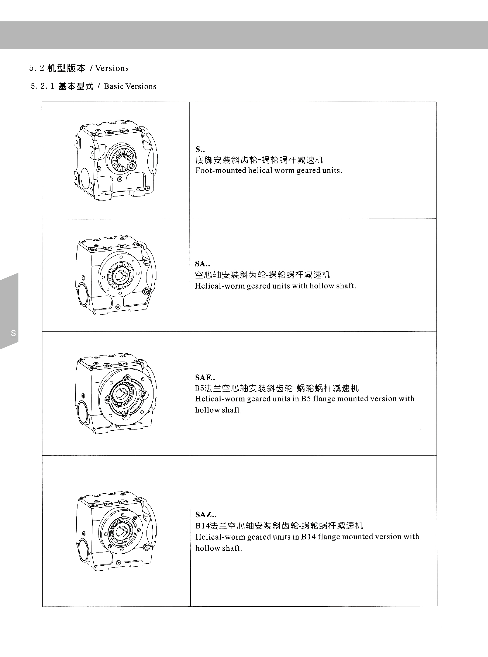 The S series helical gear-worm reducer is an efficient and compact transmission device that combines the transmission technology of helical gears and worm gears, and has the characteristics of high transmission efficiency, large torque transmission capacity and long life. This series of reducers adopts optimized design and reasonable structure, and is suitable for a variety of installation methods, including foot installation, hollow shaft installation, flange installation, etc., to meet the needs of different equipment.