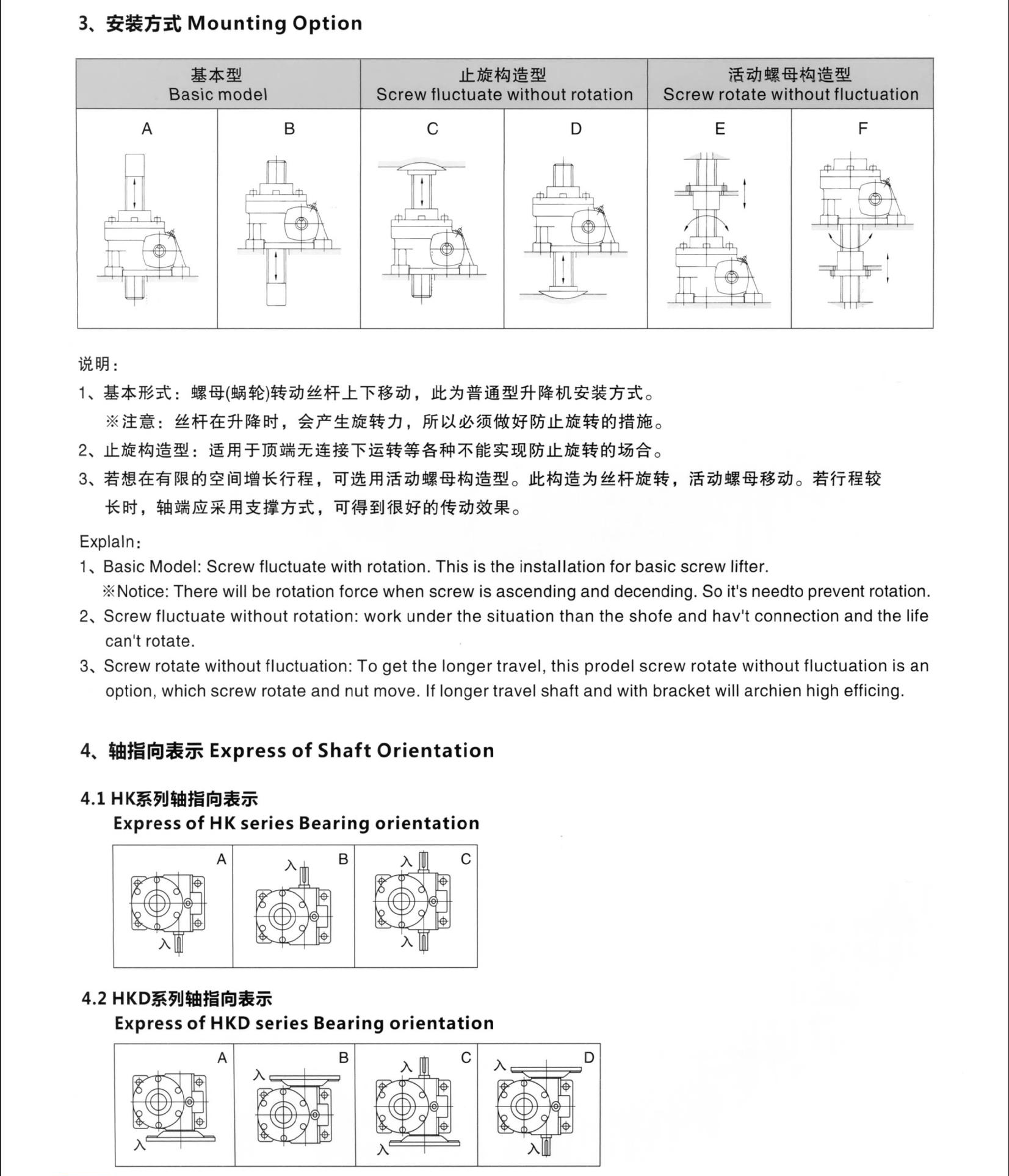 Various structural forms: The products are divided into type 1 and type 2 structures. Type 1 is the rotation of the nut and the axial movement of the screw; type 2 is the rotation of the screw and the axial movement of the nut. The assembly types are type A and type B, corresponding to the upward (downward) movement of the nut (screw) respectively.